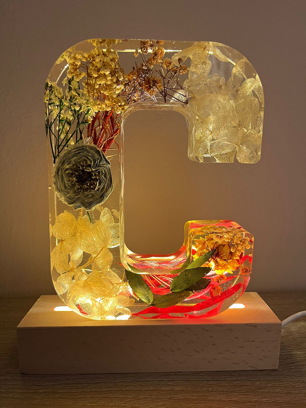 Puedes escoger entre lámparas con encapsulado de flores preservadas, objetos de tu bebé, recuerdos, etc...